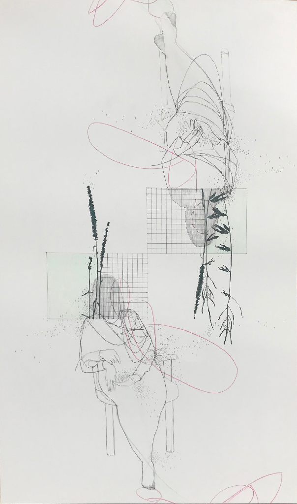The liminal state of waiting is strongly connected to these transitions between everyday and medical spaces. This state of not-knowing can be stressful and strange, where worst-case scenarios are explored and weighed against the possibility that it might be nothing. Time becomes odd, it can speed up or drag on, and the internal dialogue can make you feel as though you exist in a different plane or a suspended reality. In my prints, bodies drift and disappear into their surroundings, slip between both sides of the paper, collapse and expand, physically enacting the mental state of waiting.